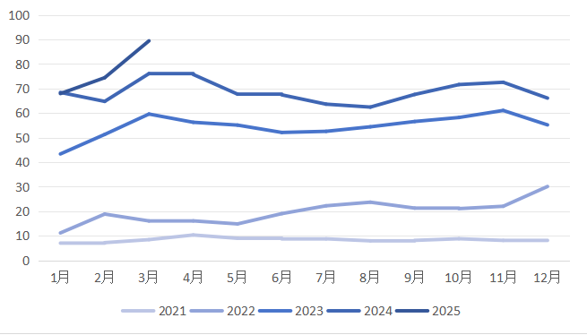 图3 2021-2025年(1-3月)海外民众对来华航班和住宿的月均日搜索指数